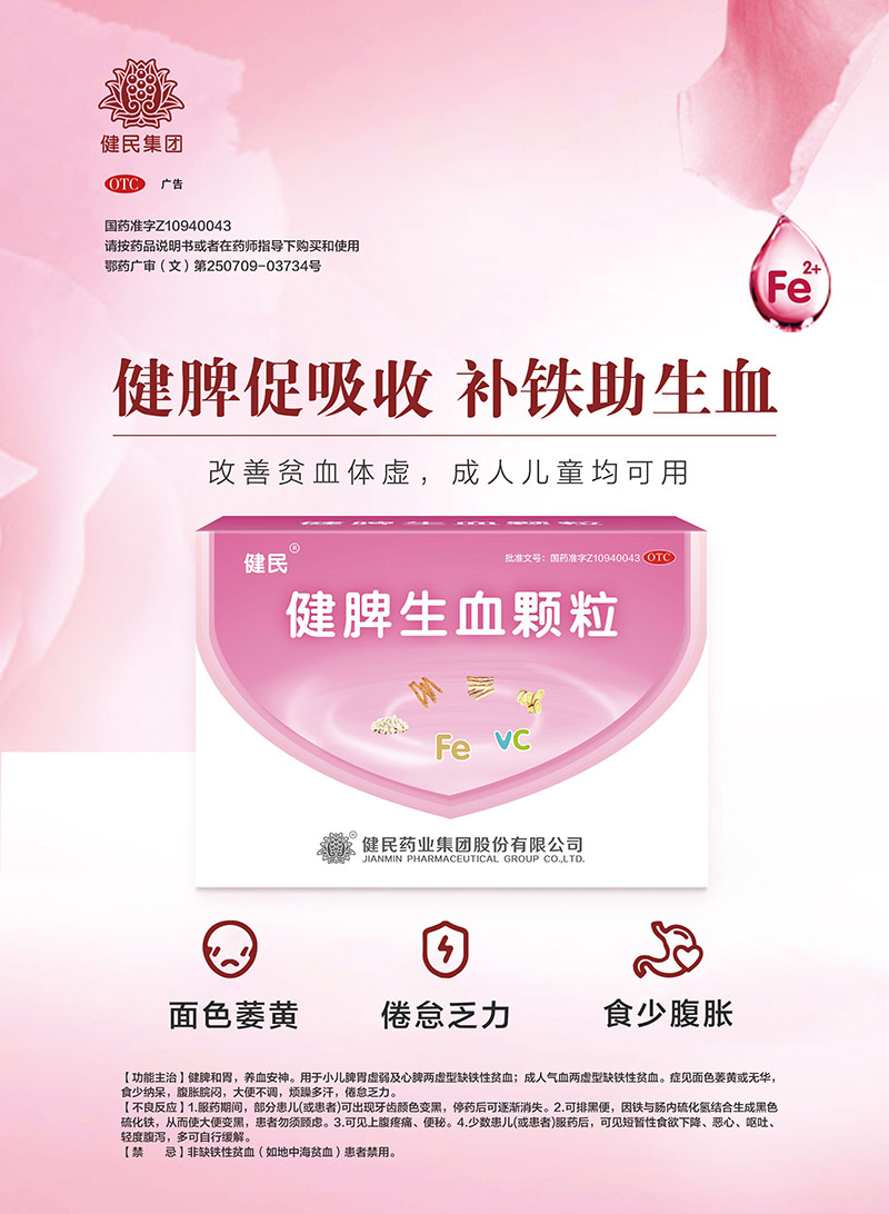 健脾和胃,养血安神。用于小儿脾胃虚弱及心脾两虚型缺铁性贫血;成人气血两虚型缺铁性贫血;症见面色萎黄或无华,食少纳呆,腹胀脘闷,大便不调,烦躁多汗,倦怠乏力。